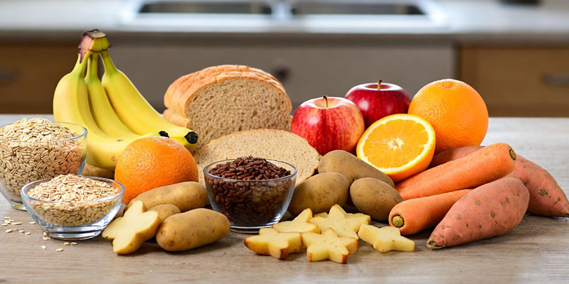 Prompt: “A vibrant illustration of various healthy carbohydrate sources including whole grains like oats and brown rice, fruits like bananas and apples, vegetables like potatoes and carrots, arranged on a wooden table with nutritional icons showing calories, fiber, and glycemic index, in a fresh and appetizing style for a nutrition blog.”